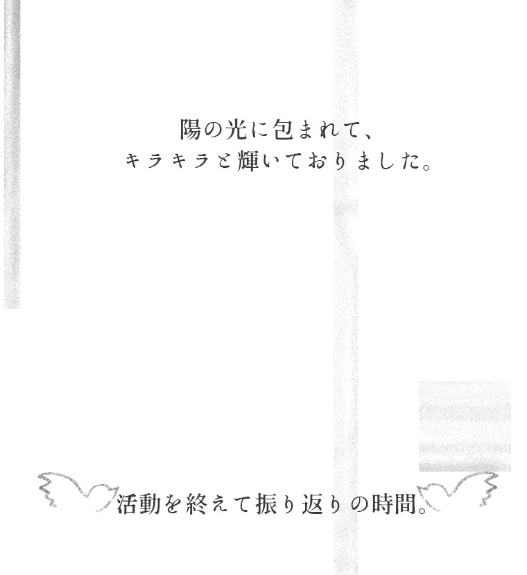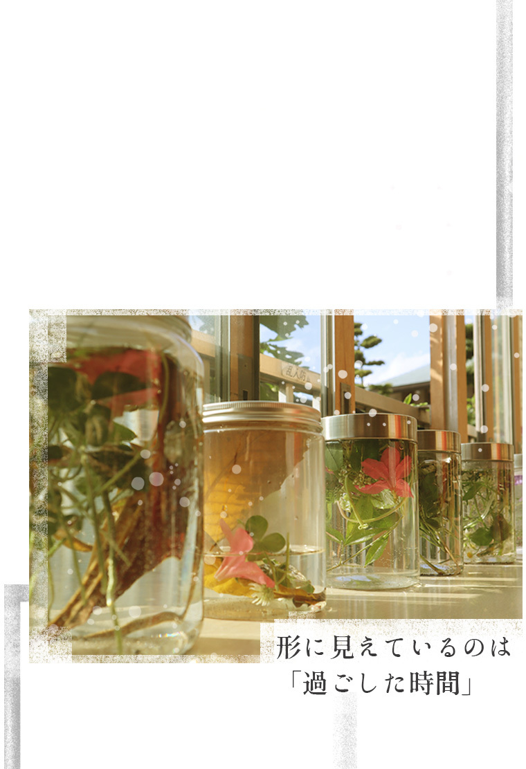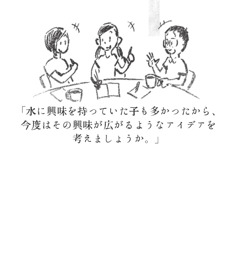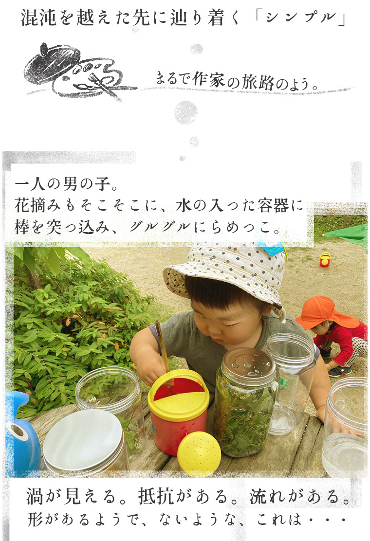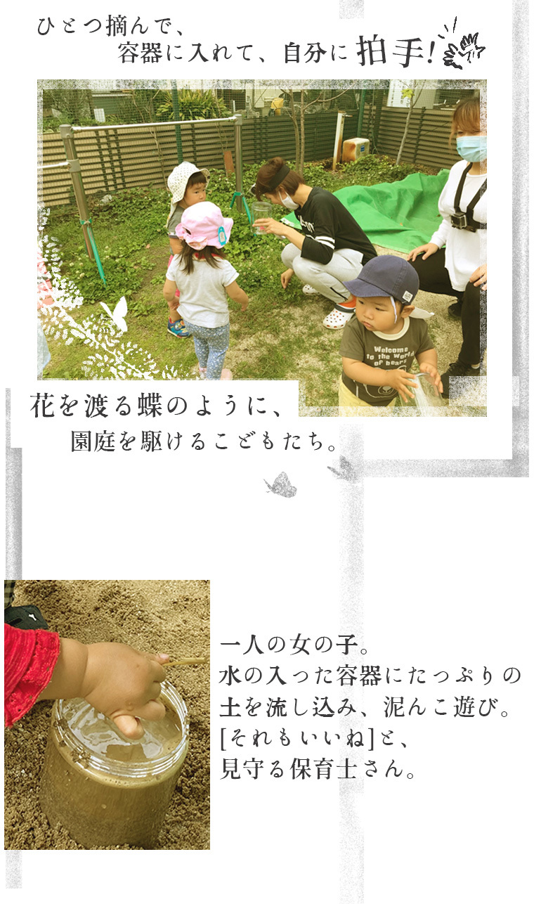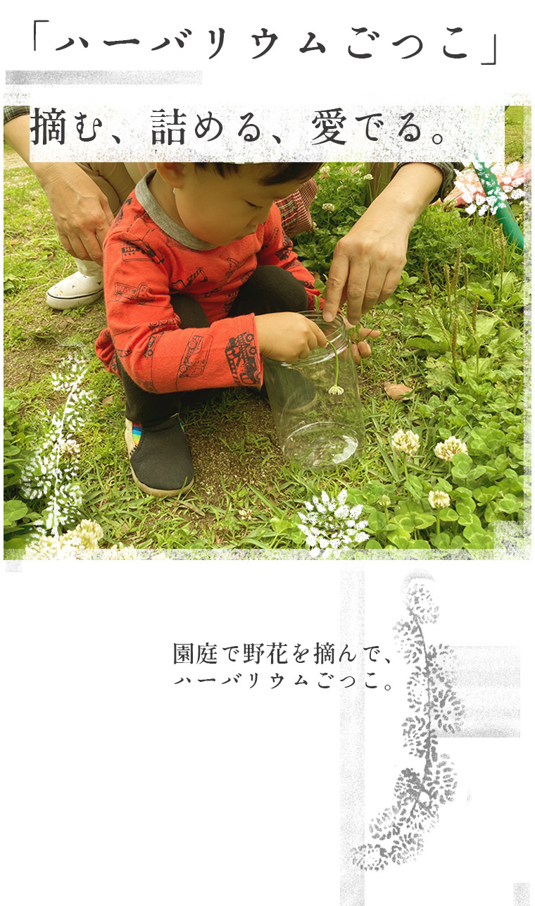 「ハーバリウムごっこ」 摘む、詰める、愛でる。園庭で野花を摘んで、ハーバリウムごっこ。ひとつ摘んで、容器に入れて、自分に拍手!花を渡る蝶のように、園庭を駆けるこどもたち。一人の女の子。水の入った容器にたっぷりの土を流し込み、泥んこ遊び。[それもいいね]と見守る保育士さん。入れては流し、入れては流し。満足したのか、その子が最後に入れたのは・・・一輪の花でした。混沌を越えた先に辿り着く「シンプル」まるで作家の旅路のよう。一人の男の子。花摘みもそこそこに、水の入った容器に棒を突っ込み、グルグルにらめっこ。渦が見える。抵抗がある。流れがある。形があるようで、ないような・・・。これは、いったいなんだ。モノを見つめ、モノの流れに気づく2さいの春。形に見えているのは「過ごした時間」陽の光に包まれて、キラキラと輝いておりました。活動を終えて振り返りの時間。「水に興味を持っていた子も多かったから、今度はその興味が広がるようなアイデアを考えましょうか。」私たちは、流れの中に住んでいる。