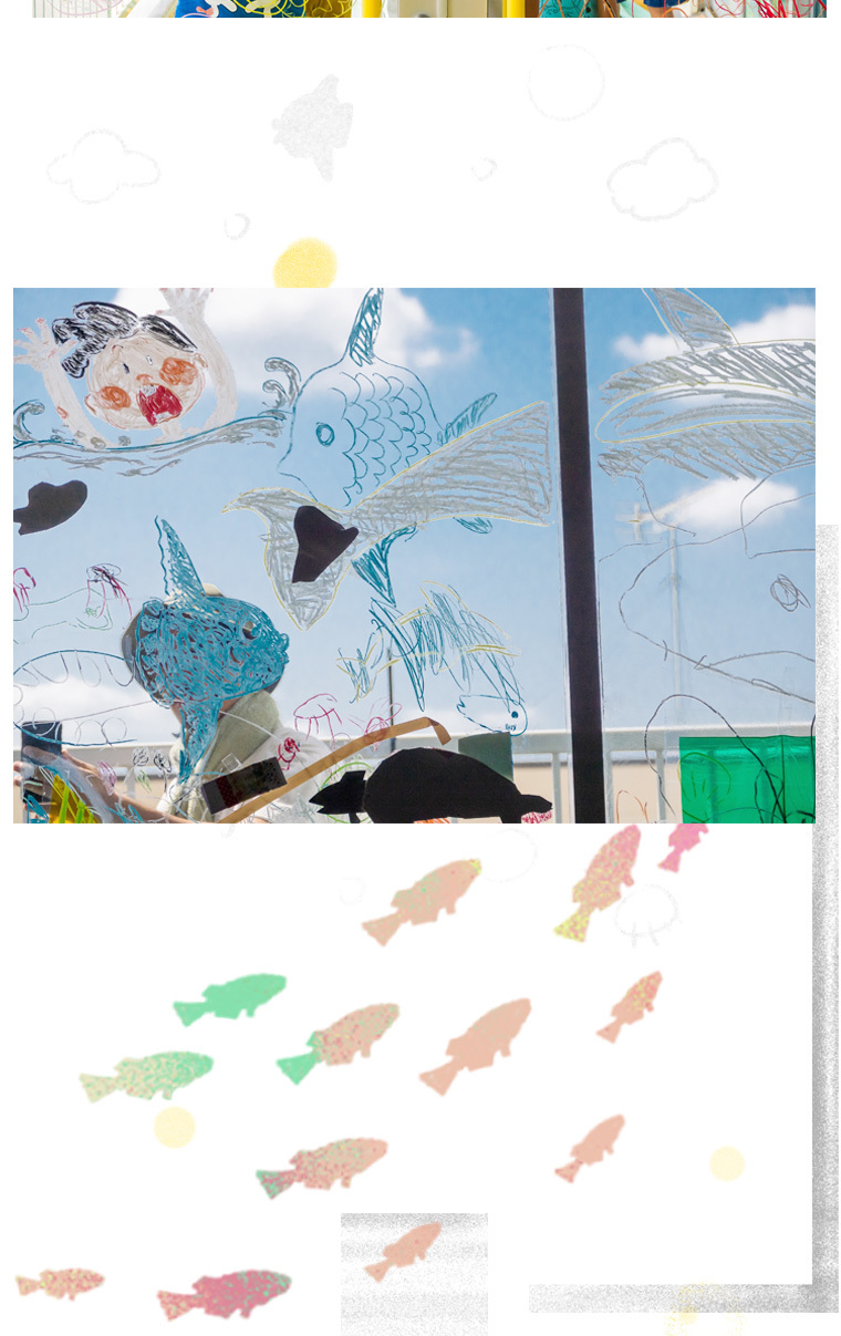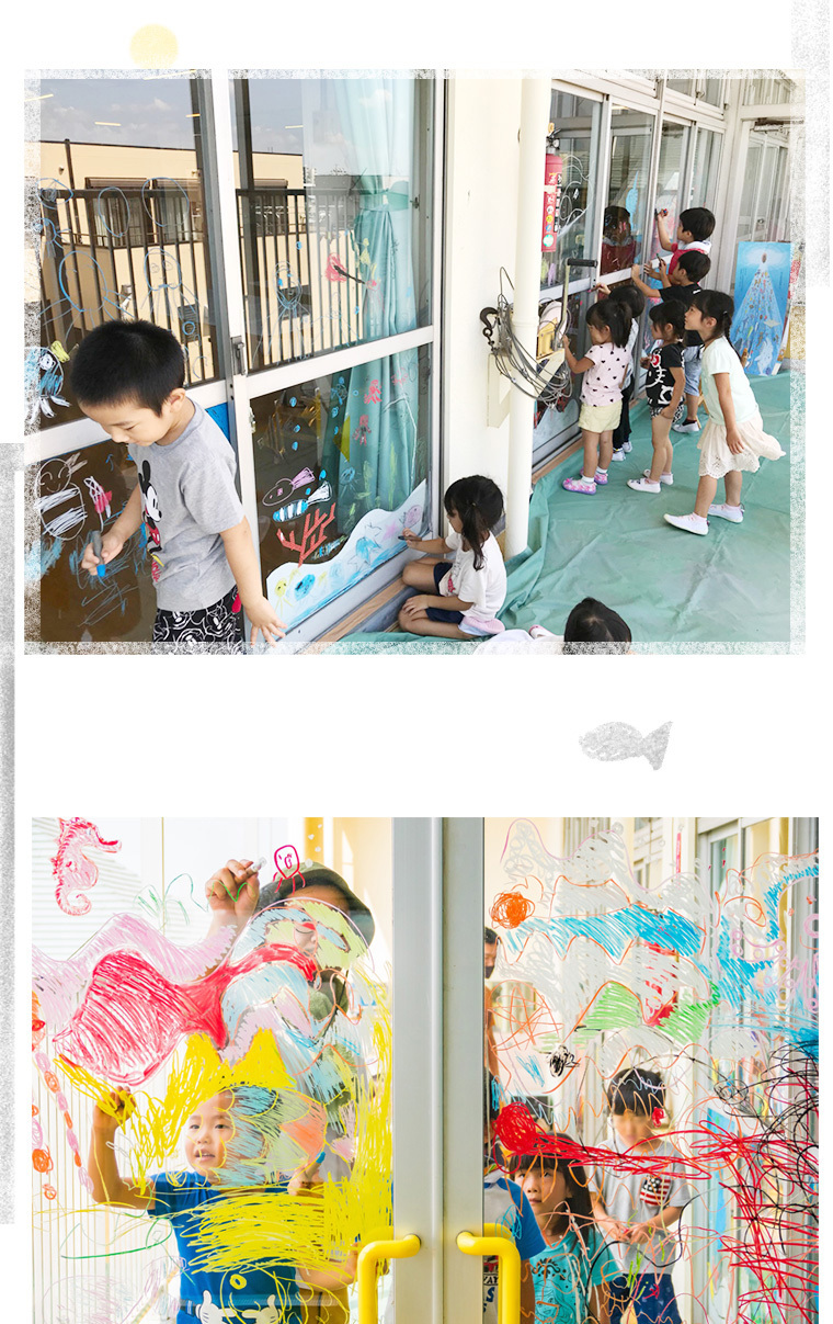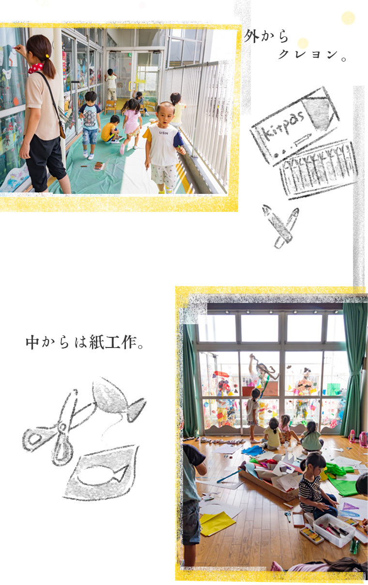 今日は3階テラスの窓にお絵かき。外からクレヨン。中からは紙工作。外に出る子。中に残る子。