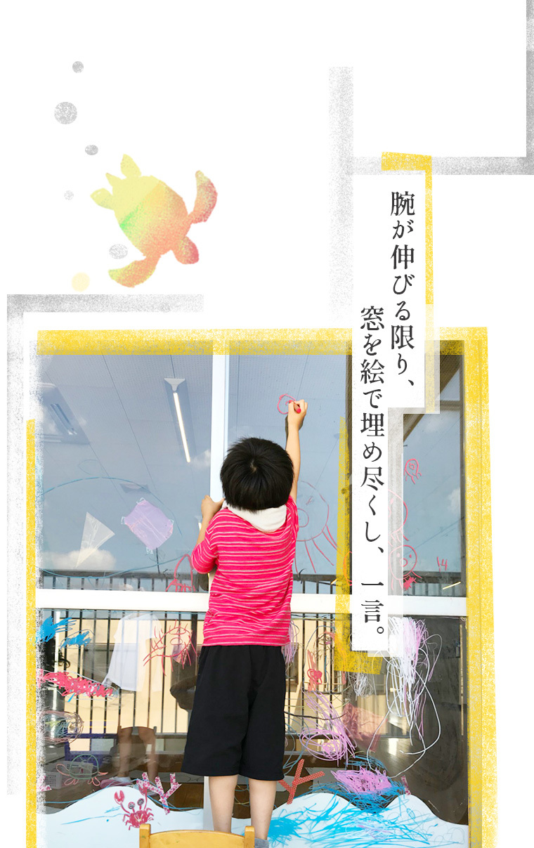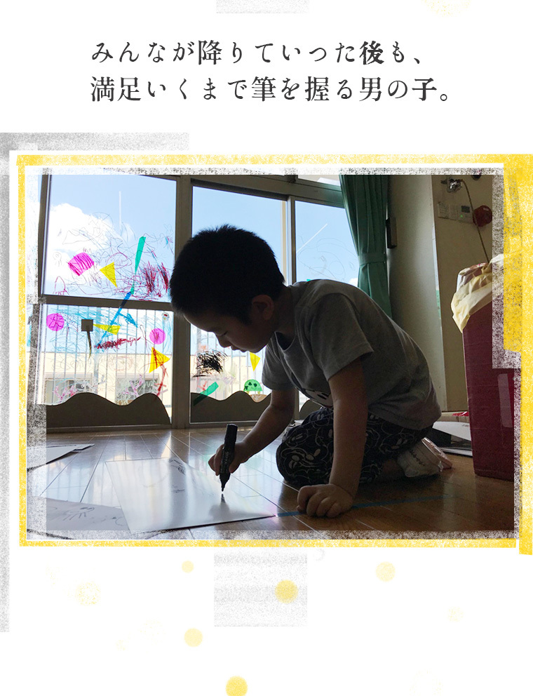 みんなが降りていったあとも満足いくまで筆を握る男の子。熱中の先に、この子にしか築けない未来がある。