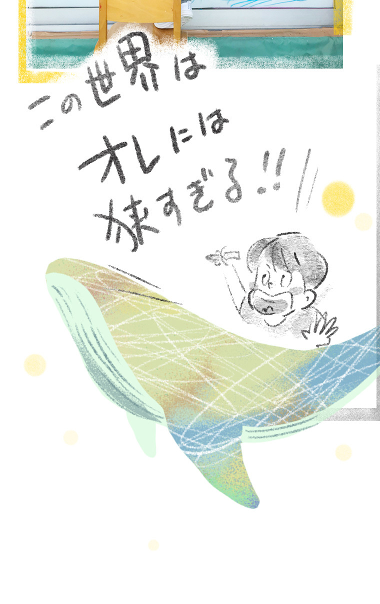 腕が伸びる限り、窓を絵で埋め尽くし。一言。「この世界はもう、オレには狭すぎる!」