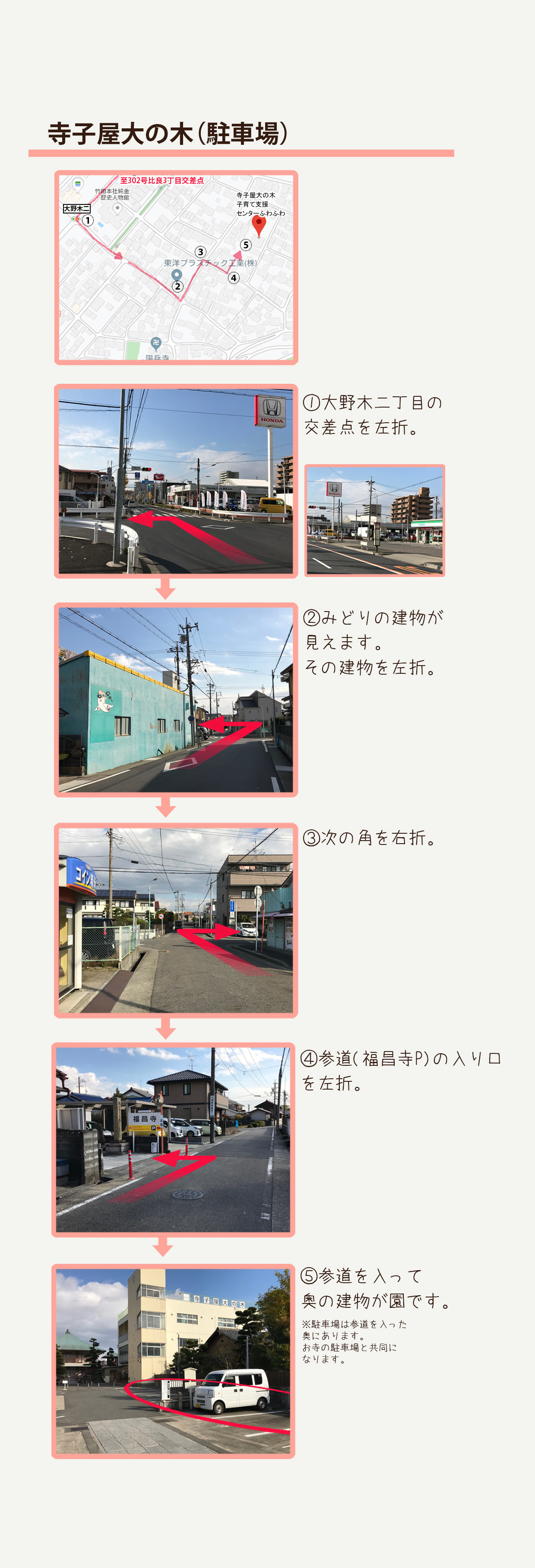 302号比良3丁目の交差点を南にまがり、大野木二丁目の交差点(ファミリーマートの前)を左折するとみどりの建物が見えます。その建物を左折し、次の角を右折すると15mほどで参道の入り口が見えます。参道を入って奥の建物が園です。